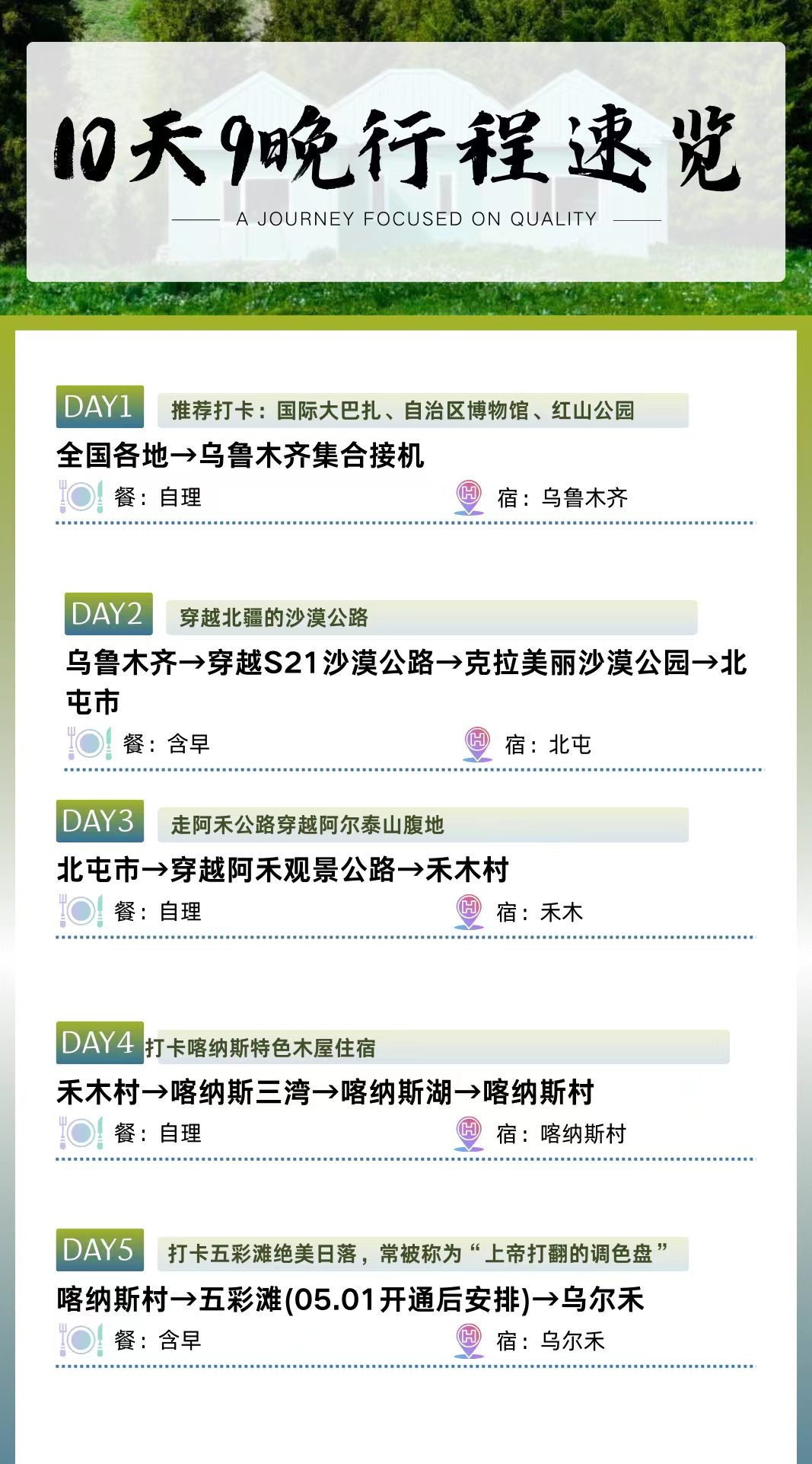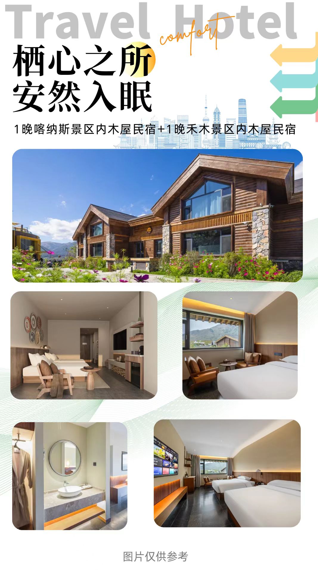 3.入住景区是为了有更多的时间在景区游览,禾木喀纳斯因地理位置,物资较难运送,因此景区内住宿价格高且条件较差,均为木屋形式住宿,敬请谅解,只能保证干净卫生,有条件可自备一次性睡袋。